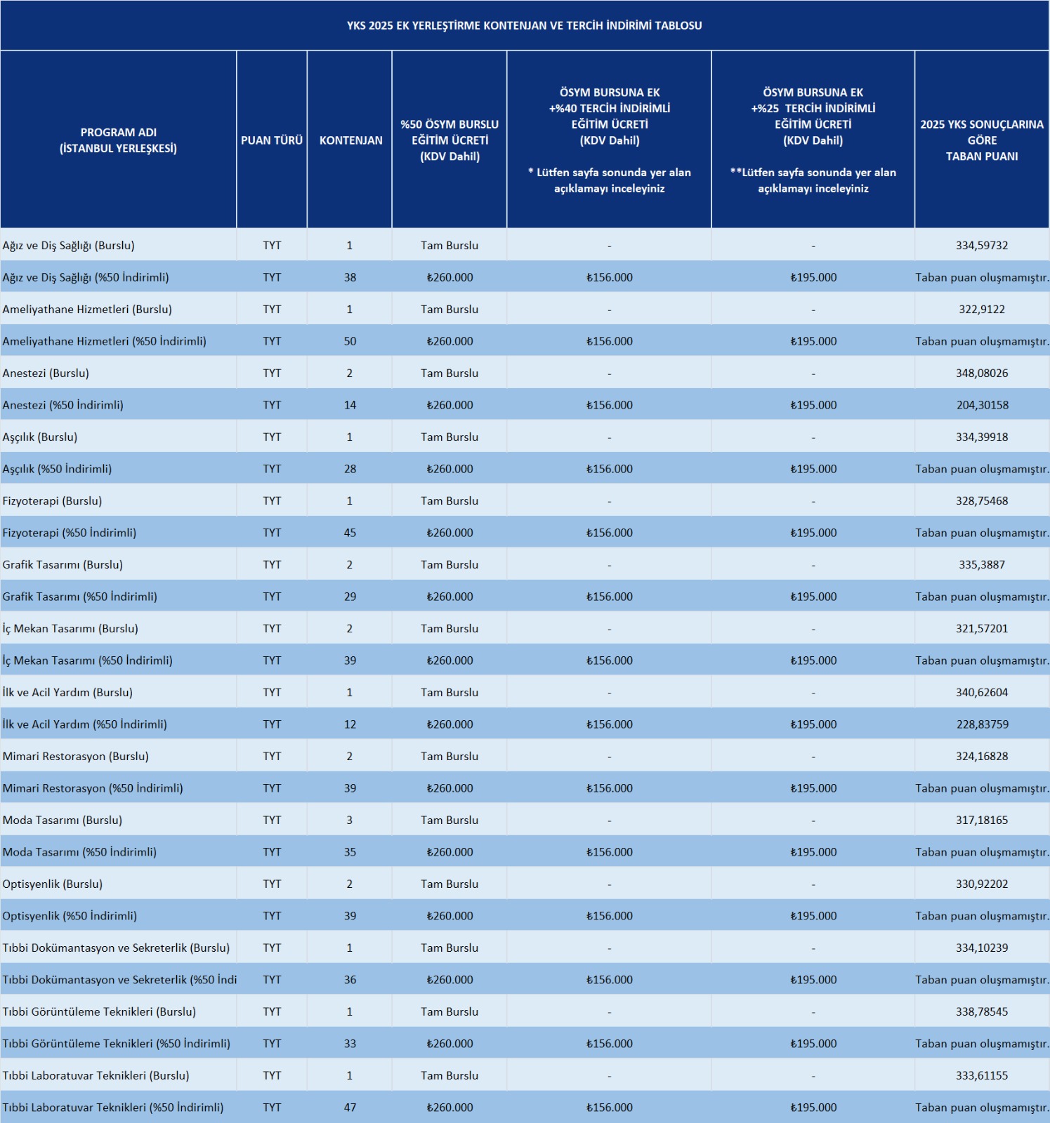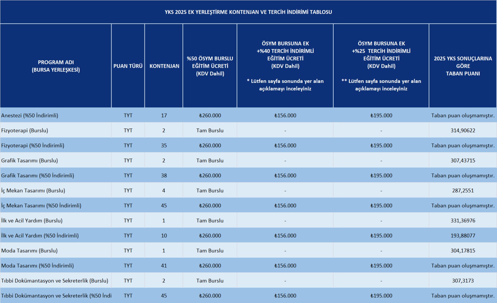 •Bu tabloda belirtilen tercih indirimleri 2025 yılı ek kontenjan döneminde yerleşen öğrenciler için geçerlidir.